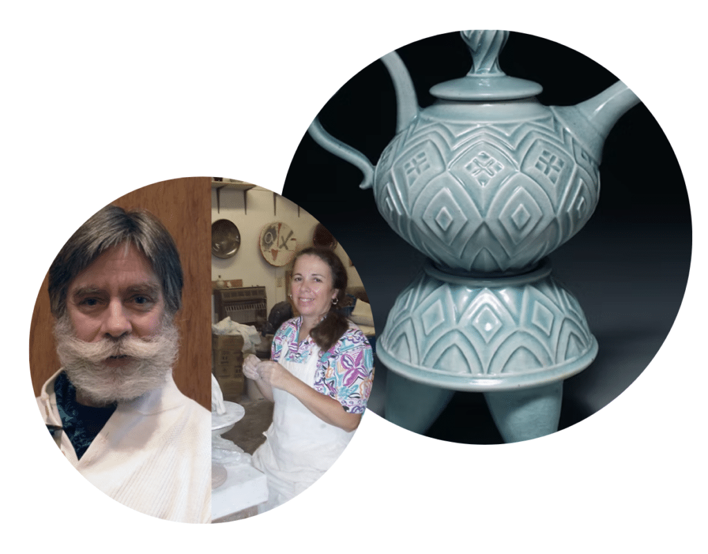 Workshop Description: Lynnette Hesser and Steve will simultaneously demonstrate a variety of throwing and handbuilding techniques used in the making of their work while discussing aesthetics and philosophies on ceramic art and design. They will show how to alter forms by darting, stretching, and reforming them, then embellish with carvings, sprigs, lids and/or handles, etc. Learn how to manipulate the thrown form, carve dimensional geometric and organic designs on your work, and how to add detailed edgings for bowls, plates, and platters. Leave with a new understanding of how to better create and glaze clay pieces.